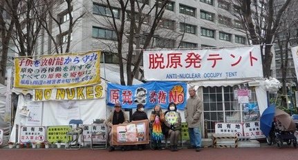 [Fr. 07.03.14] Tamiko Tani wird dieses Jahr 90 Jahre alt. Jeden Freitag sitzt sie mit Protestschildern vor dem Anti-Atom-Zelt. Zum Demonstrieren sei sie nicht mehr fit genug, aber so könne sie auf ihre Weise jedem der vorbei gehe ihre Meinung zeigen. Tamiko ist eine von vielen überzeugten UnterstützerInnen des Anti-Atom-Zelts. Dieses Anti-Atom-Zelt, auch Zeltplatz (Tento Hiroba テントひろば) genannt, wurde am 11. September 2011 im Rahmen der Demonstration zum Gedenken an Fukushima errichtet. Es steht an einer stark befahrenen Kreuzung, direkt vor dem Tokioter Wirtschaftsministerium, dem Ort der Atompolitik. Auf diese Weise zeige man ständige Präsenz. Da man befürchtet die Polizei würde das Zelt sonst wegreißen, ist seit nunmehr zweieinhalb Jahren Tag und Nacht jemand vor Ort. Von hier aus werden auch die Freitagsdemonstrationen mit-koordiniert, die jeden Freitag um 18:30 Uhr vor dem etwa 15 Gehminuten entfernten Sitz des Premierministers stattfinden.