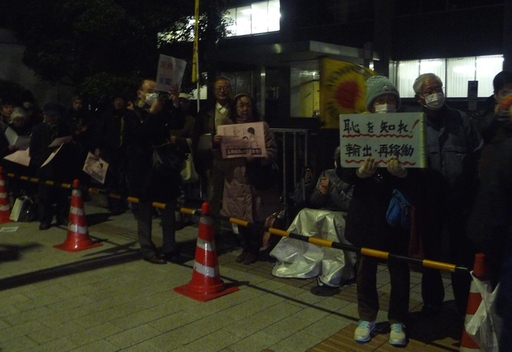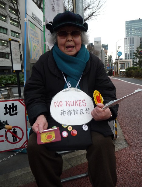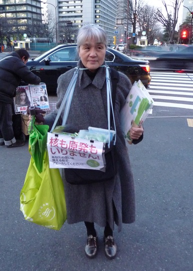 Kimiko Inui (77 Jahre), die vor dem Zelt die Stellung gehalten hatte, erzählt sie komme seit zwei Jahren regelmäßig dreimal die Woche hierher. Vor der Fukushima-Katastrophe habe sie sich nicht für Atomkraft interessiert. Manche seien ja schon nach den Reaktorkatastrophen von Three Mile Island und Tschernobyl aktiv geworden, aber den meisten gehe es so wie ihr.