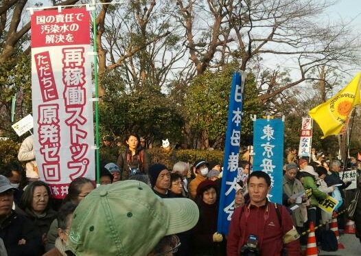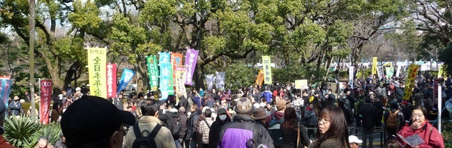 Nach der Kundgebung folgt die Demonstration vom Hibiya-Park zum Sitz des Premierministers. Allerdings wird der Demonstrationszug von der Polizei immer wieder aufgehalten und in kleine Grüppchen aufgeteilt. Dennoch zählen die Veranstalter 30.000 Teilnehmer. An den Straßen haben sich Unterstützergruppen aufgestellt, die den vorbeikommenden Zug anfeuern. Trotz der Behinderung durch die Polizei ist die Stimmung kämpferisch. Man ist zufrieden mit der Aktion: Der Kampf muss und wird weitergehen.