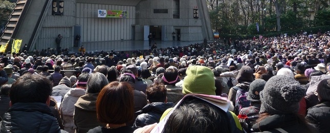 [So. 09.03.14] Heute, an diesem sonnigen Sonntagmittag, haben sich Tausende Menschen im Hibiya Park in Tokyo für die Gedenkveranstaltung zum Fukushima-Jahrestag eingefunden, mitten im politischen Machtzentrum Tokyos. Von 13 Uhr bis 14 Uhr (5 Uhr bis 6 Uhr MEZ) werden in der Hibiya Open-Air Concert Hall Reden von Betroffenen und Unterstützern gehalten. Da die Tribünen der Halle nur etwa 5.000 Menschen fassen, müssen viele Teilnehmer draußen den Übertragungen zuhören. Vor dem Eingang der Halle werden Flyer verteilt und Unterschriften für verschiedene andere Aktionen gesammelt.