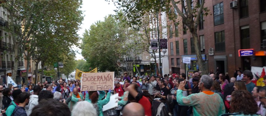 [Sa. 11.10.14] „Wir sind Menschen keine Ware!“, „Ja, wir können das!“, „Setzt die Regierung ab!“ Das und vieles mehr riefen die Demonstranten, die sich heute in Madrid versammelt hatten, um im Rahmen der europäischen Aktionswoche gegen TTIP und Fracking zu demonstrieren. Um 18 Uhr startete der Demonstrationszug an der Gloreta de Atocha. Begleitet von Trommeln und lauten Rufen marschierten die Teilnehmer zwei Stunden durch die Innenstadt. Es herrschte eine entschlossene Stimmung und die Überzeugung etwas ändern zu müssen. Nach der Abschlusskundgebung an der Plaza de la Provincia zog ein Großteil weiter zum Plaza del Sol um Solidarität gegenüber der mit Ebola infizierten Krankenschwester ausdrücken, der die Regierung Eigenverschulden vorwirft. Montagabend nehme ich an einer Versammlung beteiligter Gruppen teil und werde mit verschiedenen Aktivisten reden.